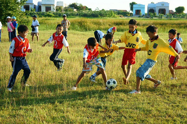 Hình ảnh trẻ em chơi đá banh không chỉ tăng cường sức khỏe mà còn có tác dụng tốt trong việc học